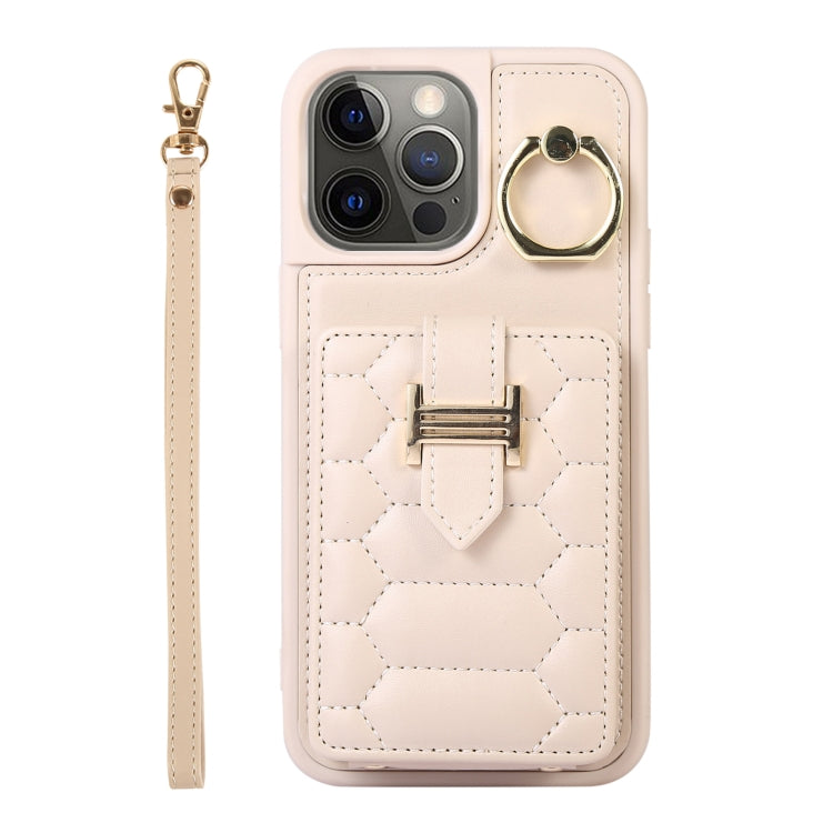 Funda para iPhone 12 Pro Max Horizontal Card Bag Ring Holder con Doble Cordón (Beige)