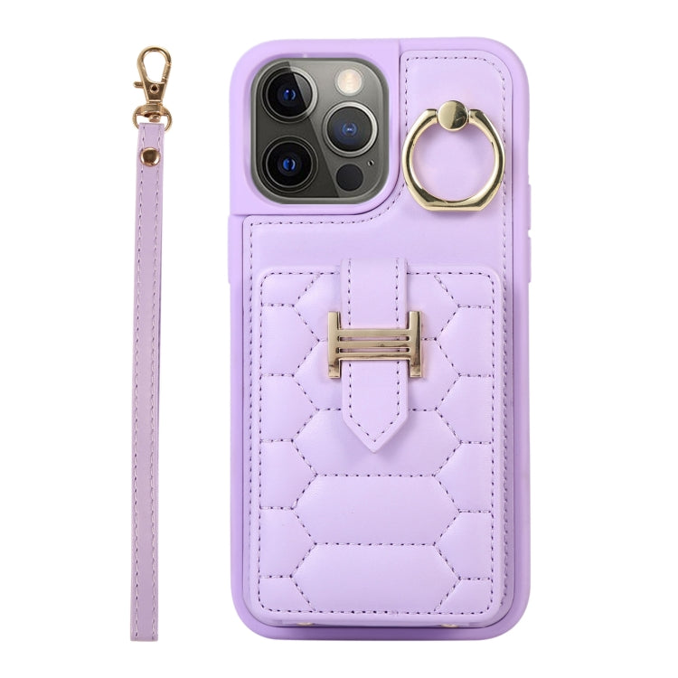Funda para iPhone 12 Pro Max Horizontal Card Bag Ring Holder con Doble Cordón (Púrpura)