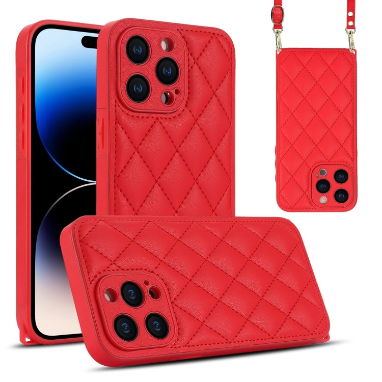 Estuche para Teléfono iPhone 14 Pro Max Textura Rómbica y Cordón Doble (Rojo)