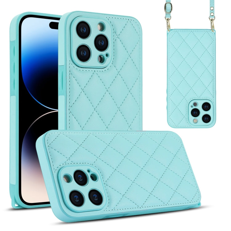 Estuche para Teléfono iPhone 14 Pro Max Textura Rómbica Cordón Doble (Verde)