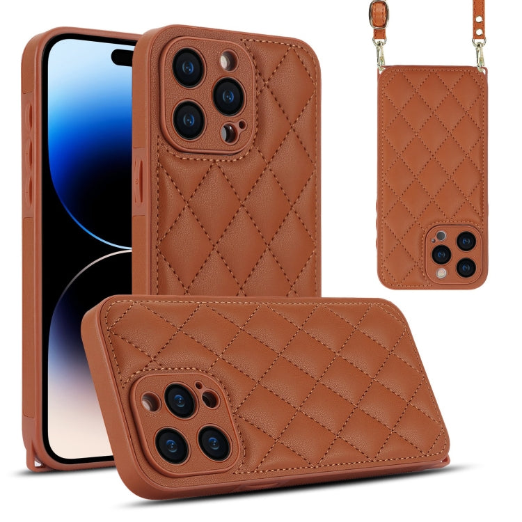 Estuche para Teléfono iPhone 14 Pro Max Textura Rómbica con Cordón Doble (Marrón)