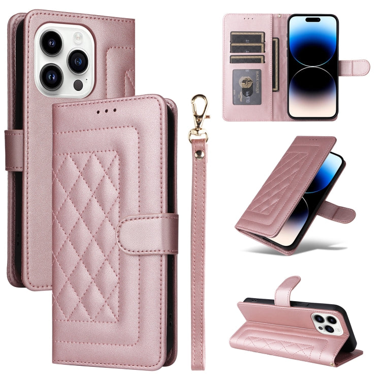 Pour iPhone 14 Pro Étui de téléphone à rabat en cuir à treillis diamant (or rose)