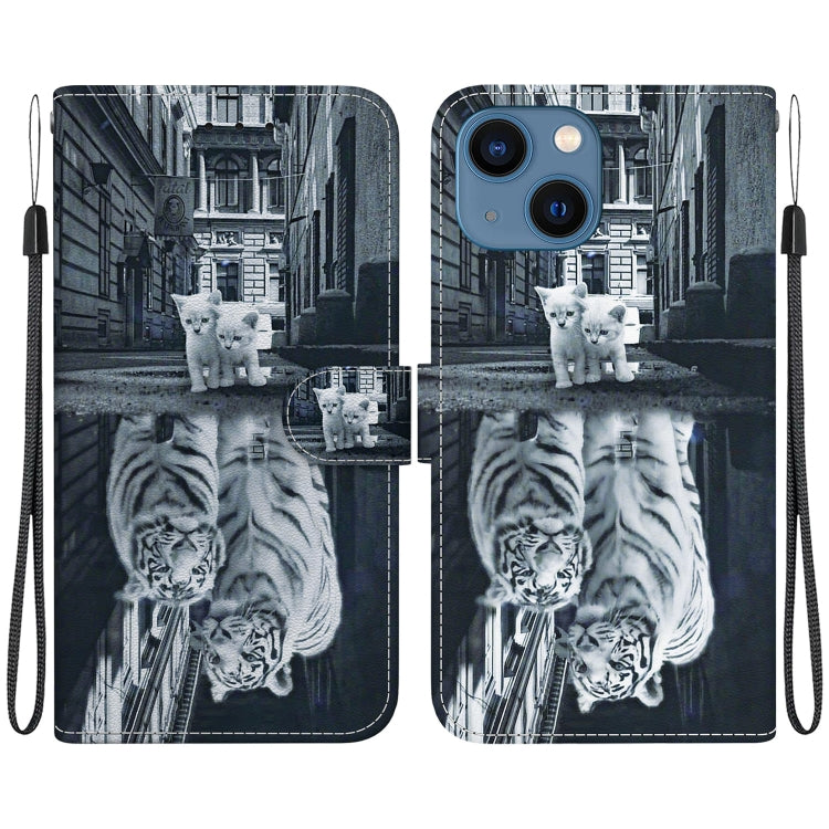 Funda de Cuero para iPhone 14 con Dibujo Coloreado y Textura de Cristal (Reflejo de Tigre Gato)