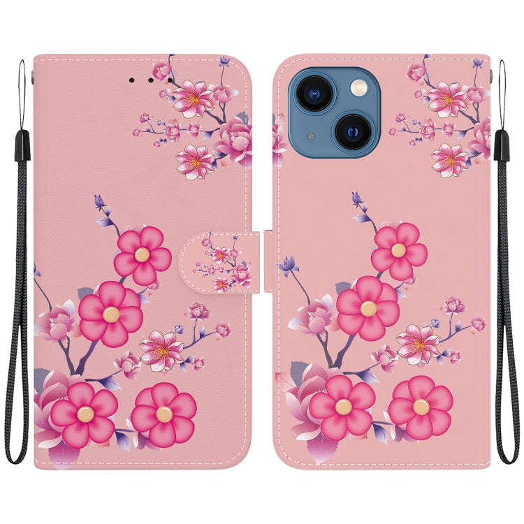 Funda de Cuero para iPhone 14 con Dibujo Coloreado y Textura de Cristal (Flor de Ciruelo)