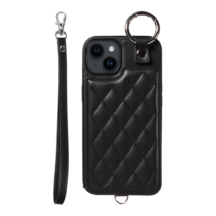 Funda para Teléfono iPhone 14 con Bolsa para Tarjetas Textura Rómbica y Cordón Corto (Negro)