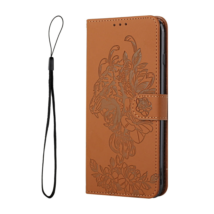 Funda de Cuero iPhone 14 Tiger Flower Repujado Protección Teléfono (Marrón)