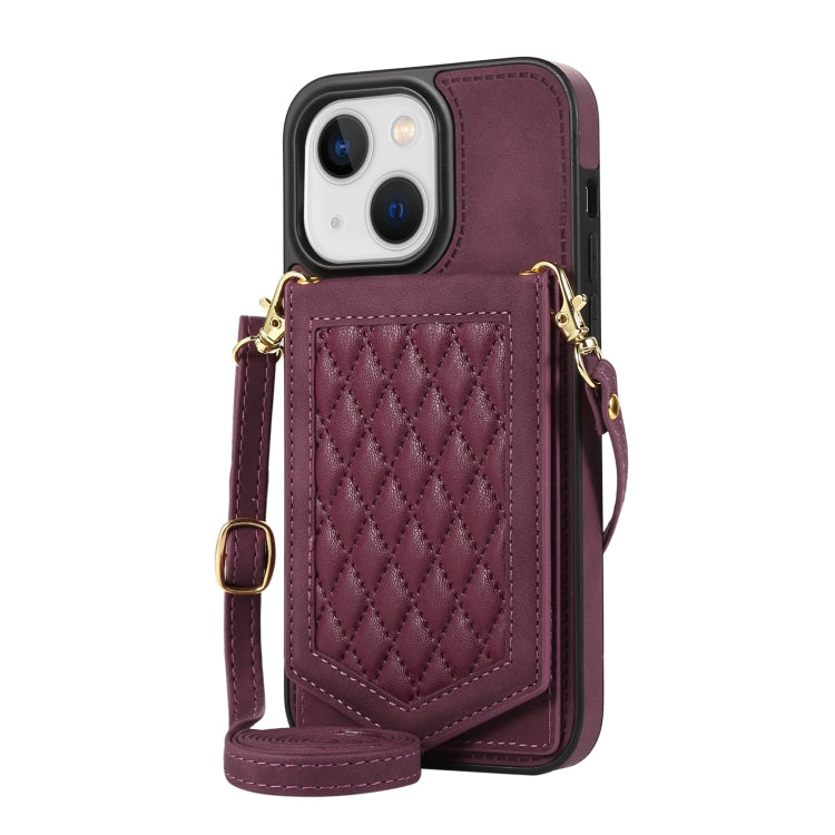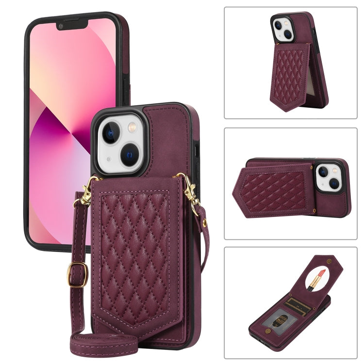 Funda para iPhone 14 Rhombic Texture Rfid con CordĂłn y Espejo (Rojo Vino)
