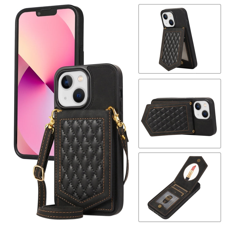 Funda para iPhone 14 Rhombic Texture Rfid con CordĂłn y Espejo (Negro)