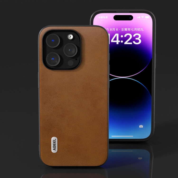 Funda de teléfono Abeel iPhone 15 Pro PU textura de becerro bicolor (Marrón)