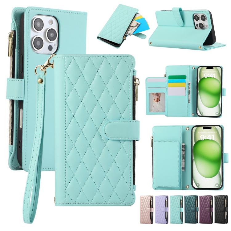 Funda de Cuero Tipo Billetera Rombal con Cremallera para iPhone 16 Pro Max (Verde)