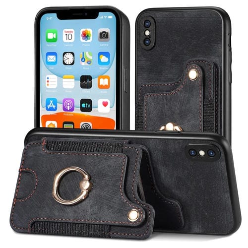 Funda para iPhone SE 2022 / SE 2020 Retro Skin-Feel Ring Multi-Card Wallet (Negro)