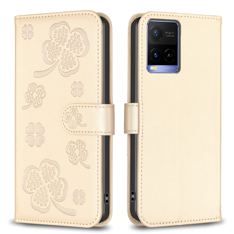 Funda de Cuero para Motorola Moto E13 4G con Relieve de Cuatro Hojas (Dorado)