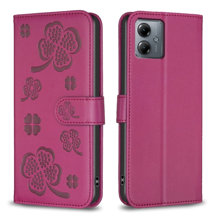 Funda de Cuero para Motorola Moto G14 4G con Relieve de Cuatro Hojas (Rojo Rosa)