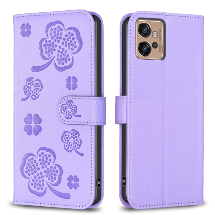 Funda de Cuero para Motorola Moto G32 4G con Relieve de Cuatro Hojas (Púrpura)