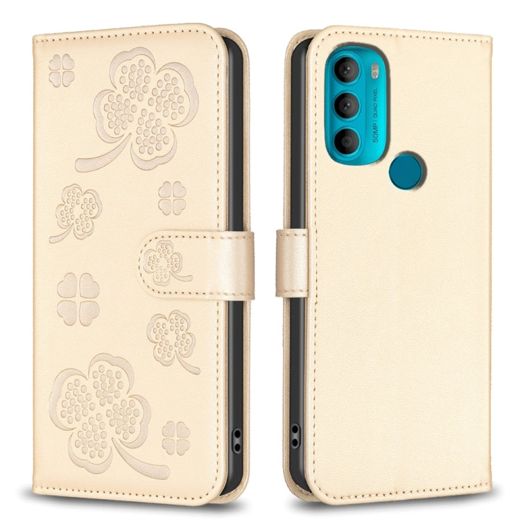 Funda de Cuero para Motorola Moto G71 con Relieve de Cuatro Hojas (Dorado)