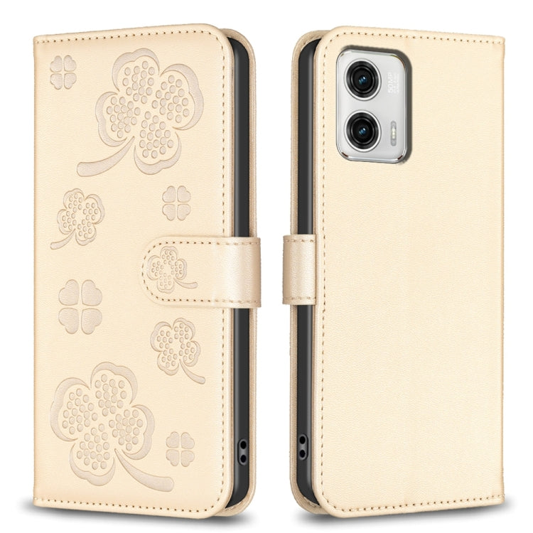 Funda de Cuero para Motorola Moto G73 5G con Relieve de Cuatro Hojas (Dorado)