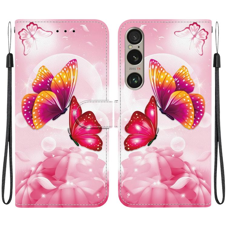 Funda de Cuero para Sony Xperia 1 Vi con Dibujo y Textura de Cristal (Mariposas Rosas)