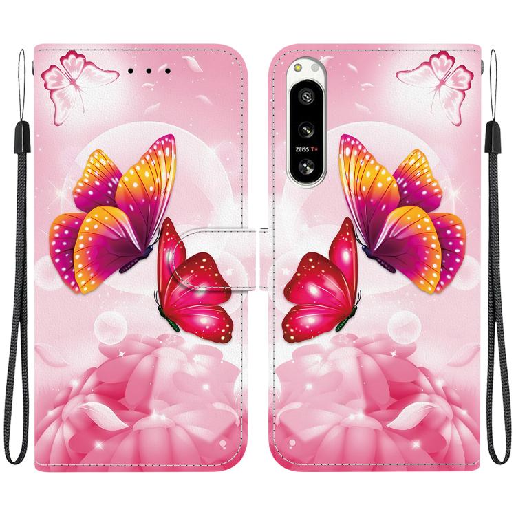 Funda de Cuero para Sony Xperia 5 Vi con Dibujo y Textura de Cristal (Mariposas Rosas)