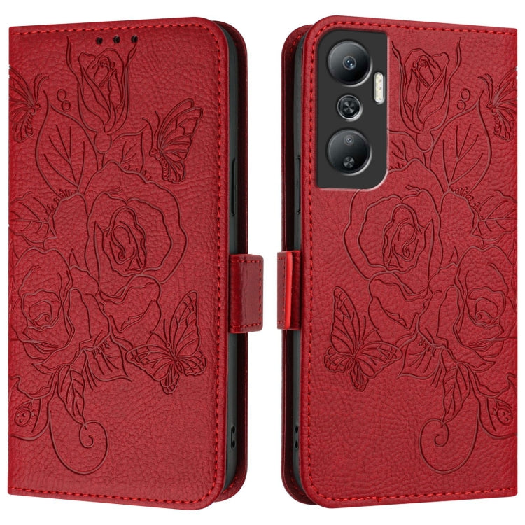 Estuche de Cuero Antirrobo Rfid para Infinix Hot 20 Play con Rosa en Relieve (Rojo)