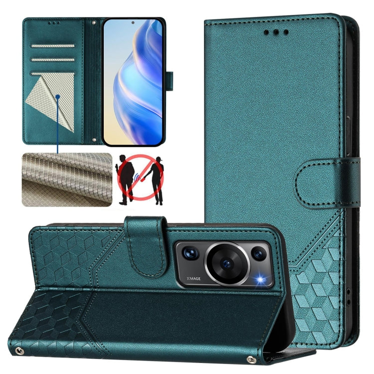 Funda de Cuero RFID con Relieve en Panal para Huawei P60/P60 Pro (Verde Pavo Real)