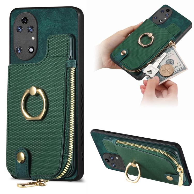 Funda para Teléfono Huawei P50 con Cremallera Vertical y Anillo de Cuero Cruzado (Verde)