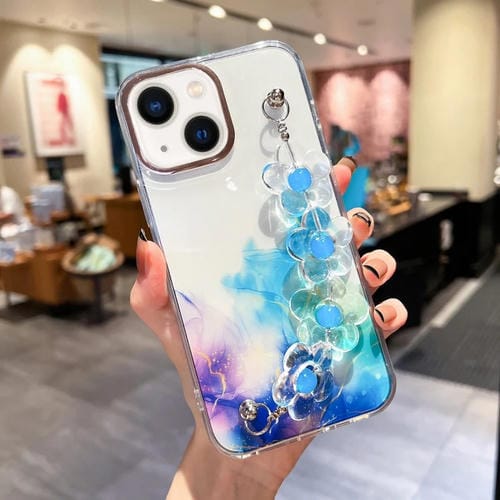 Estuche para iPhone 14 con Patrón de Mármol y Halo con Pulsera de Flores (Dorado Azul)