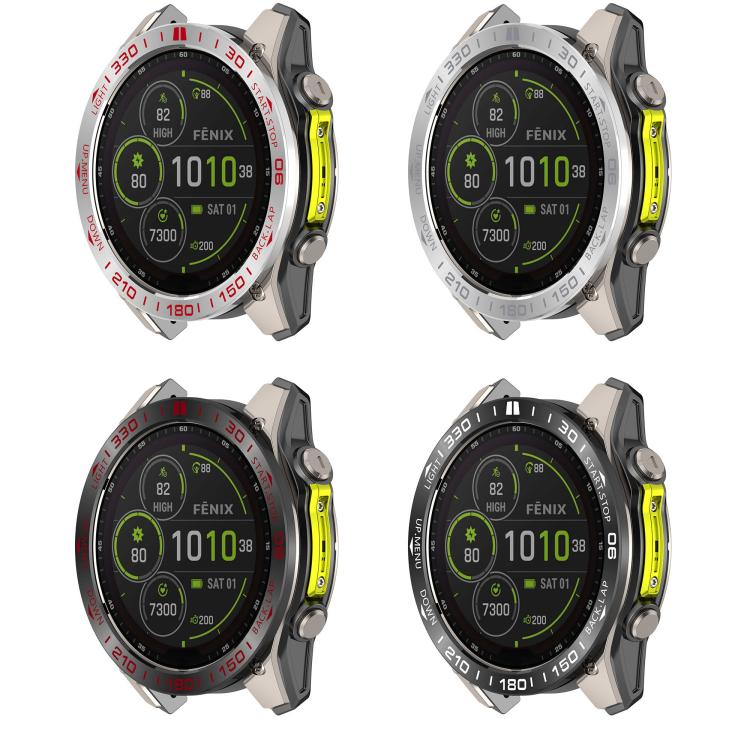 Anillo protector de acero inoxidable para reloj Garmin Tactix 8 Solar de 51 mm (estilo Compete Speed) (negro y blanco)