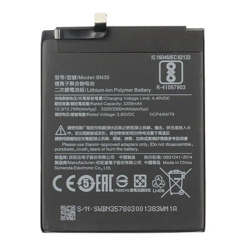 La Batería de polímero de litio modelo BN35 con capacidad de 3200mAh está diseñada específicamente para el smartphone Xiaomi Redmi 5 (2021). Este componente es compatible exclusivamente con este modelo, garantizando un rendimiento óptimo y una integración perfecta con el dispositivo. Su función principal es proporcionar una fuente de energía confiable y estable, permitiendo un tiempo de espera y duración de llamadas equivaLentes a la Batería Original. Fabricada con tecnología avanzada de iones de litio, esta Batería ofrece una larga vida útil y evita el efecto memoria común en Baterías de níquel-cadmio, asegurando un suministro continuo y eficiente de energía para el Xiaomi Redmi 5.