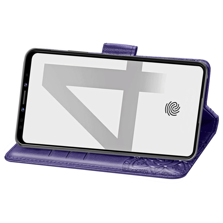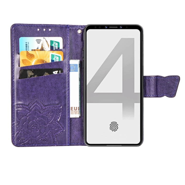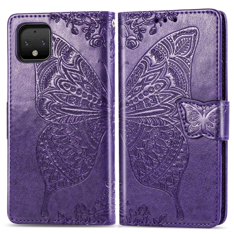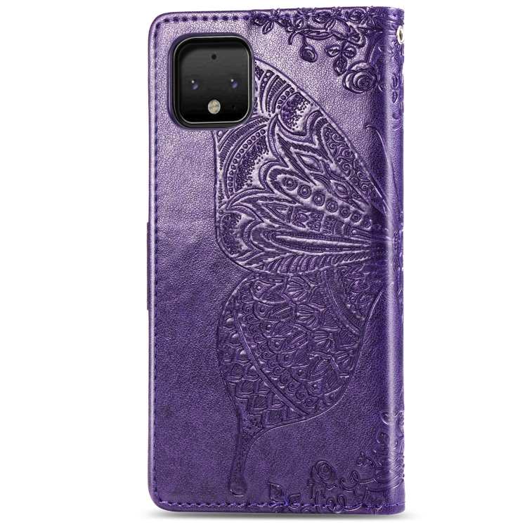 Funda de Cuero Butterfly Love Flowers para Google Pixel 4 con Tapa Horizontal, Soporte, Ranuras y Billetera (Morado Oscuro)