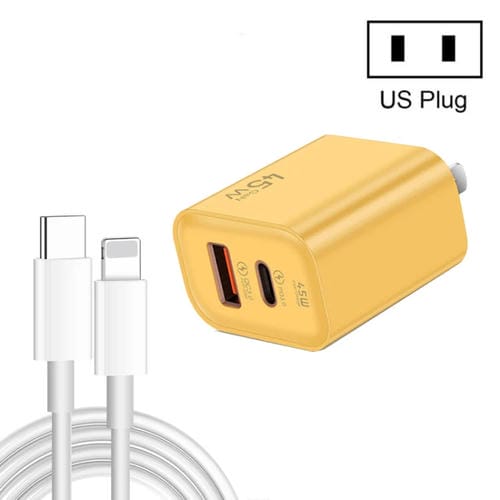 Cargador USB Súper Rápido 45Pq 45W Pd25W + Qc3.0 20W con Cable Tipo C a 8 Pines (Amarillo)