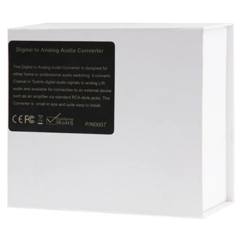 - Frecuencia de muestreo soportada: 32, 44,1, 48 y 96 KHz; entradas Toslink y 1 RCA coaxial; salidas 2 RCA analógicas; Alimentación externa DC 5V 2A; consumo máximo de 0,5 vatios; dimensiones 51 mm x 41 mm x 26 mm; peso 78 g