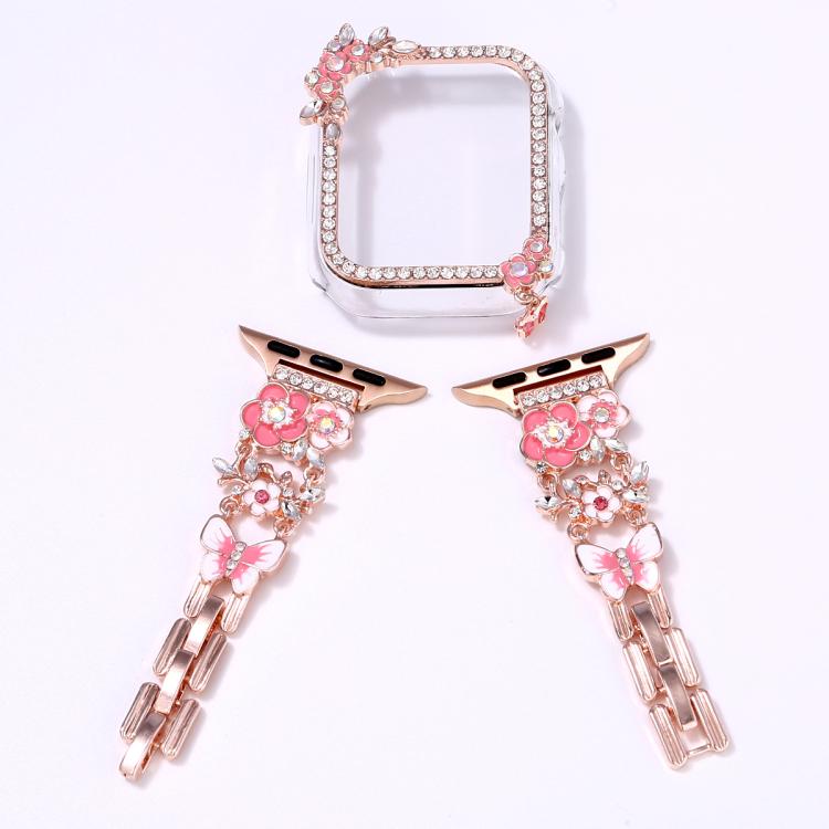 Correa hueca con un solo diamante y borlas de flores para Apple Watch Series 9/8/7 de 41 mm (oro rosa)