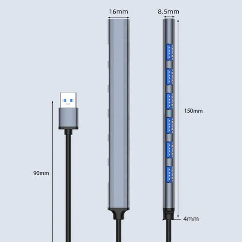 - Velocidad de transmisión teórica de hasta 5 Gbps; incluye 1 Puerto USB 3.0 y 6 Puertos USB 2.0; longitud del Cable de 90 mm; cuerpo de Cable de PVC resistente a la Flexión con junta reforzada; núcleo de alambre grueso galvanizado con blindaje multicapa para transmisión estable; dimensiones 150x16x8,5 mm