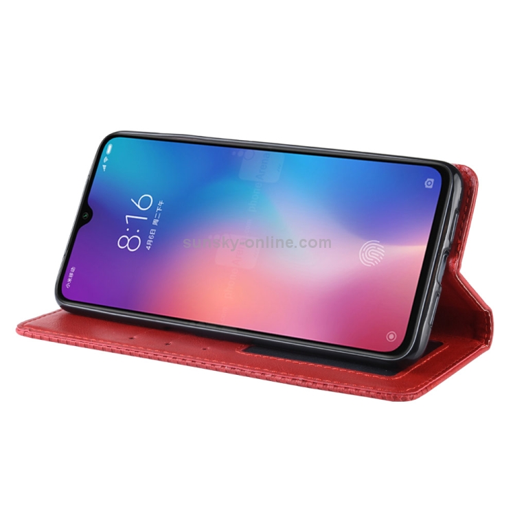 Estuche de Cuero con Tapa Horizontal con Textura Retro y Hebilla Magnética para Xiaomi Mi 9, con Soporte, Ranuras para Tarjetas y Billetera (Rojo)