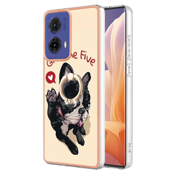 Estuche para Motorola Moto G85 con Galvanoplastia IMD Doble Cara y Soporte para Anillo (Perro de la Suerte)