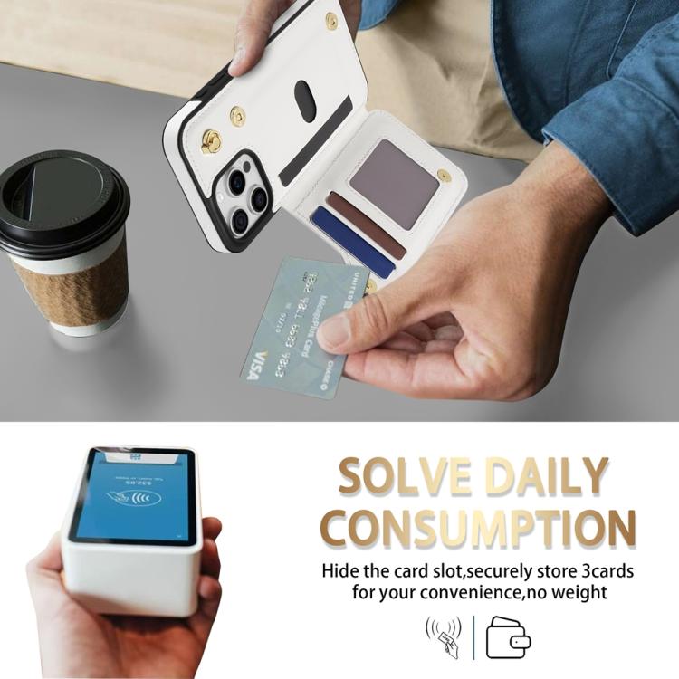 Estuche para Teléfono iPhone 13 Pro Ranuras para Tarjetas Hebilla Doble Rombal con Cordón (Blanco)