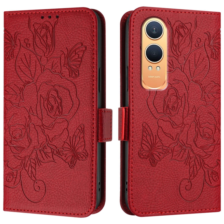 Funda de Cuero Antirrobo con Diseño de Rosa en Relieve RFID para OnePlus Nord CE4 Lite (Rojo)