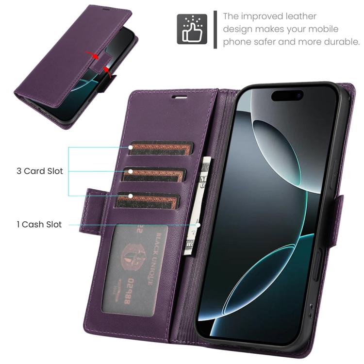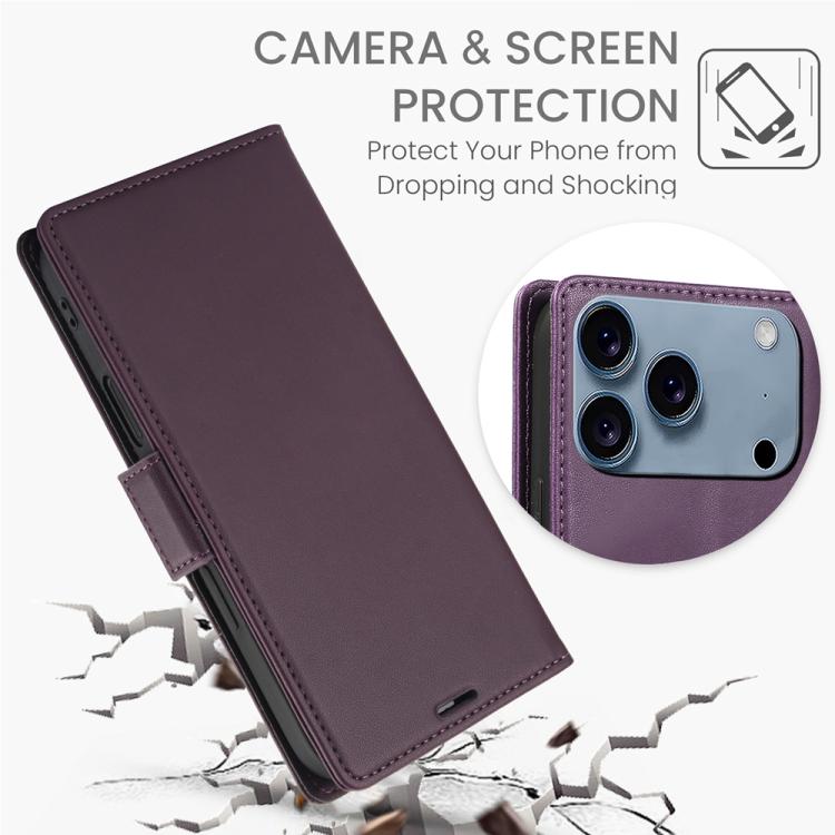 Funda de cuero antirrobo RFID con hebilla lateral para iPhone 17 Pro (morado oscuro)