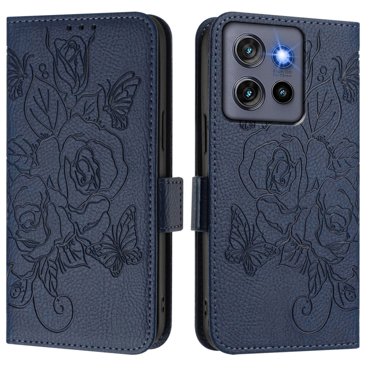Funda de Cuero Antirrobo RFID con Relieve Rosa para Motorola Edge 50 Neo (Azul Oscuro)