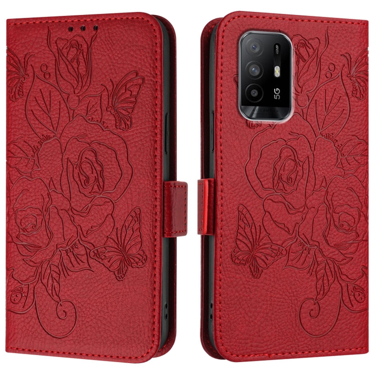 Funda de Cuero Antirrobo Rfid con Relieve Rosa para Oppo A74 4G / F19 / F19S / A95 5G / 4G (Roja)