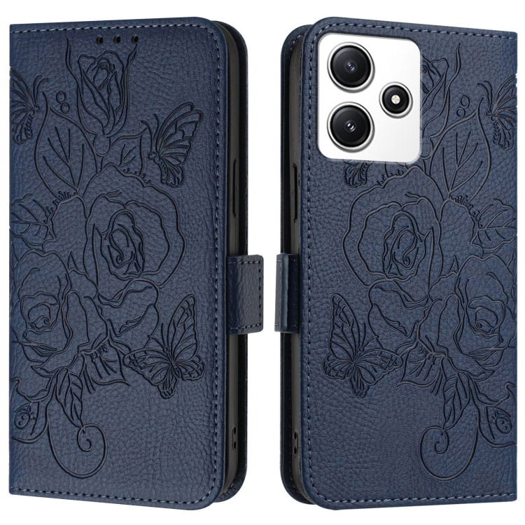 Funda de Cuero Antirrobo Rfid con Relieve Rosa para Redmi 12 5G / 4G Global / Note 12R (Azul Oscuro)