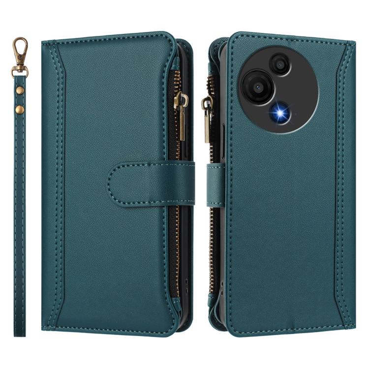 Funda de cuero con cierre magnético para TCL 605/60 SE, 9 ranuras para tarjetas, cremallera y correa de mano (verde oscuro)