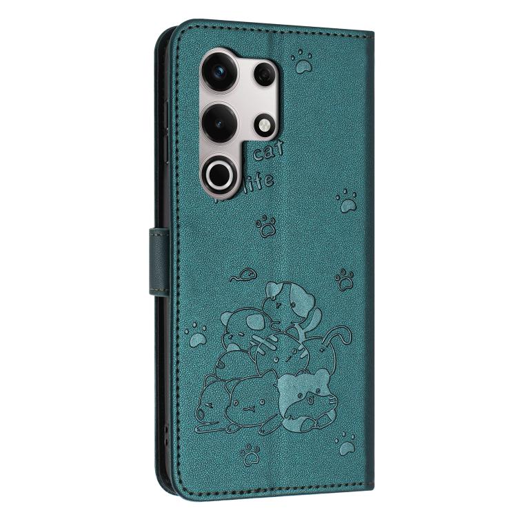 Funda de Cuero con Cordón para Teléfono Itel S25 Ultra Diseño Gatito (Verde Oscuro)