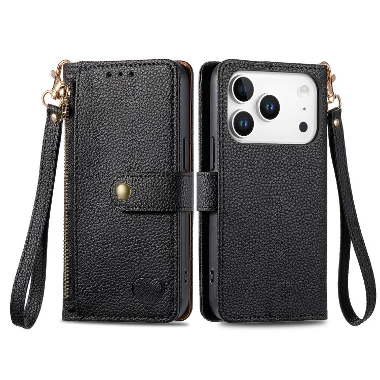 Funda de cuero con cordón y cremallera Love para iPhone 17 Pro (negra)