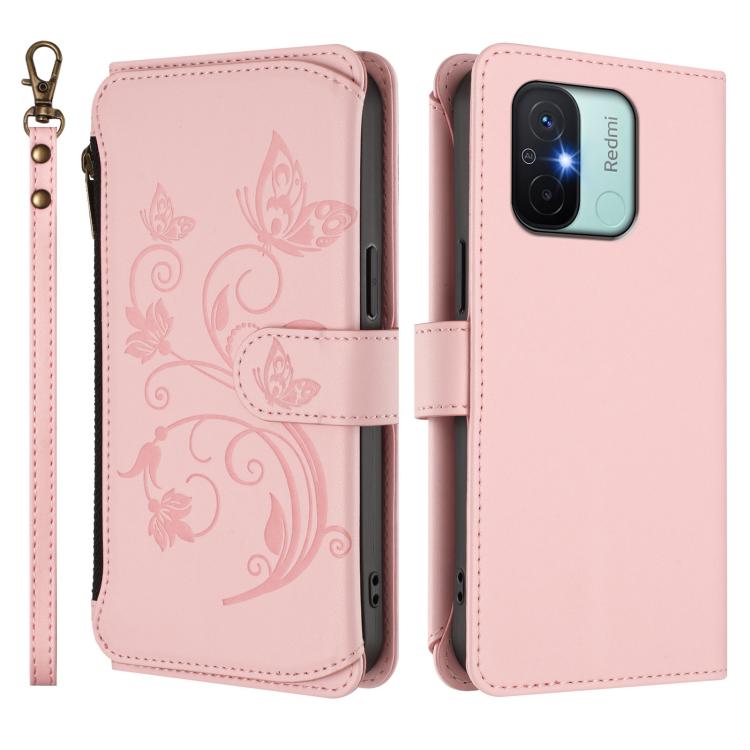 Funda de cuero con cremallera para Redmi 11A / Xiaomi Poco C55, diseño de mariposas, flores y amor, con múltiples tarjetas (rosa)