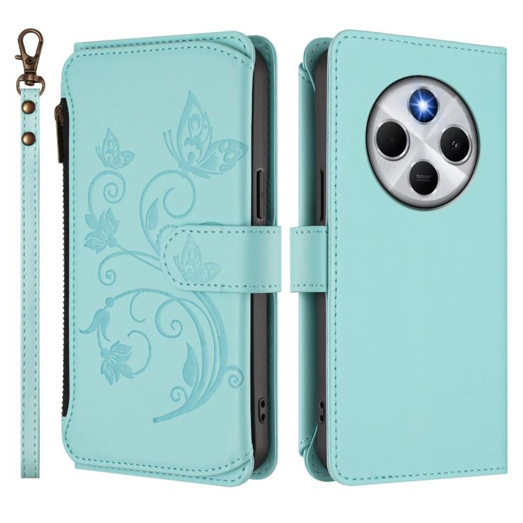 Funda de cuero con cremallera para Redmi A4 5G / A3 Pro / 14C 4G / 14R, diseño de mariposas y flores, con múltiples tarjetas (verde menta)