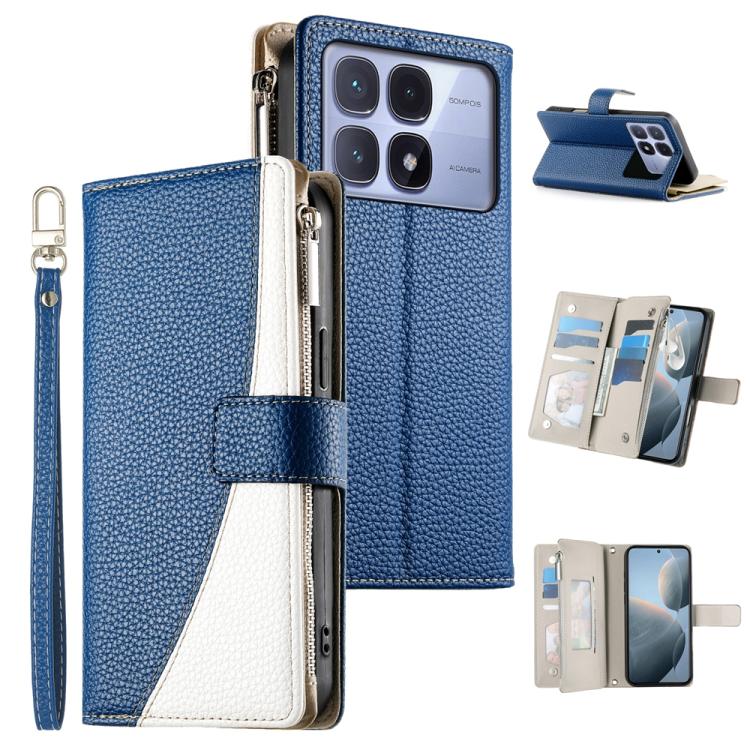Funda de cuero con cremallera para Redmi K70 Ultra, con costuras, múltiples tarjetas y correa corta (azul oscuro)