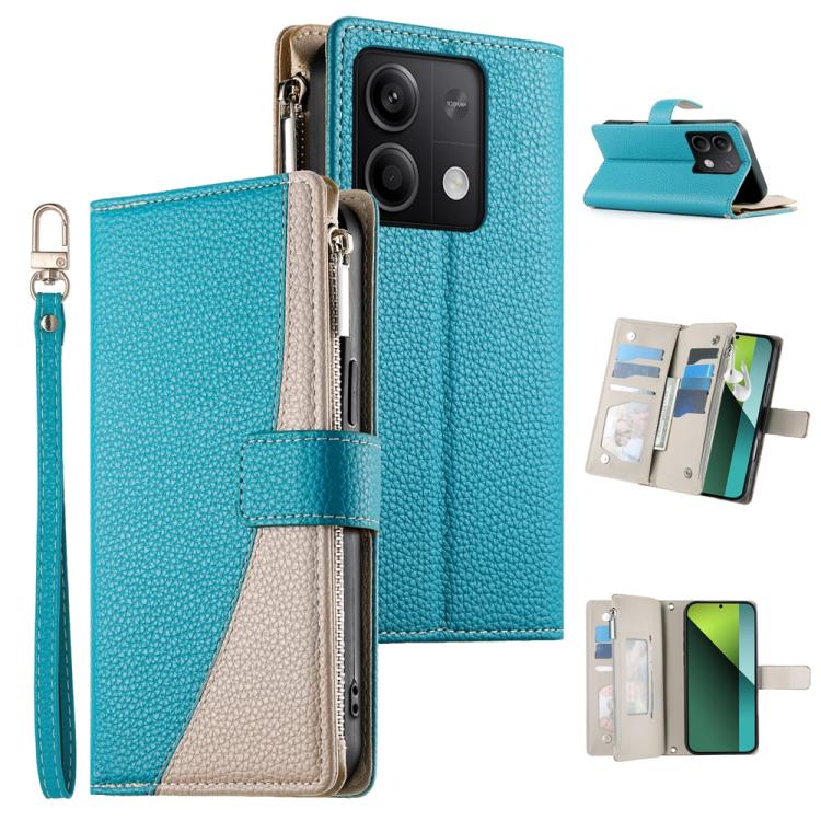 Funda de cuero con cremallera para Redmi Note 13 5G, con costuras globales, múltiples tarjetas y correa corta (azul)