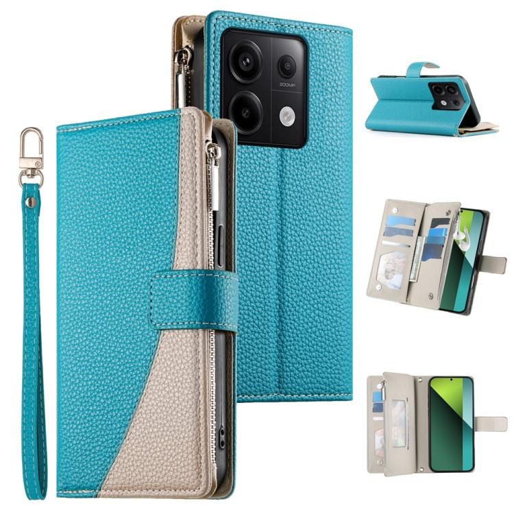 Funda de cuero con cremallera para Redmi Note 13 Pro y Xiaomi Poco X6, con costuras, para múltiples tarjetas y correa corta (azul)