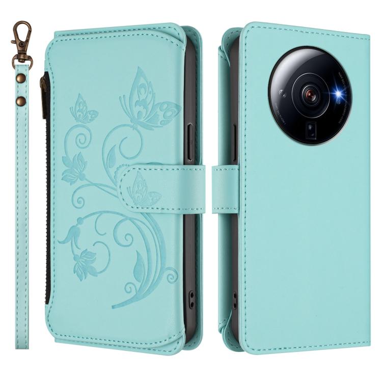 Funda de cuero con cremallera para Xiaomi 12S Ultra, diseño de mariposas, flores y mariposas (verde menta)